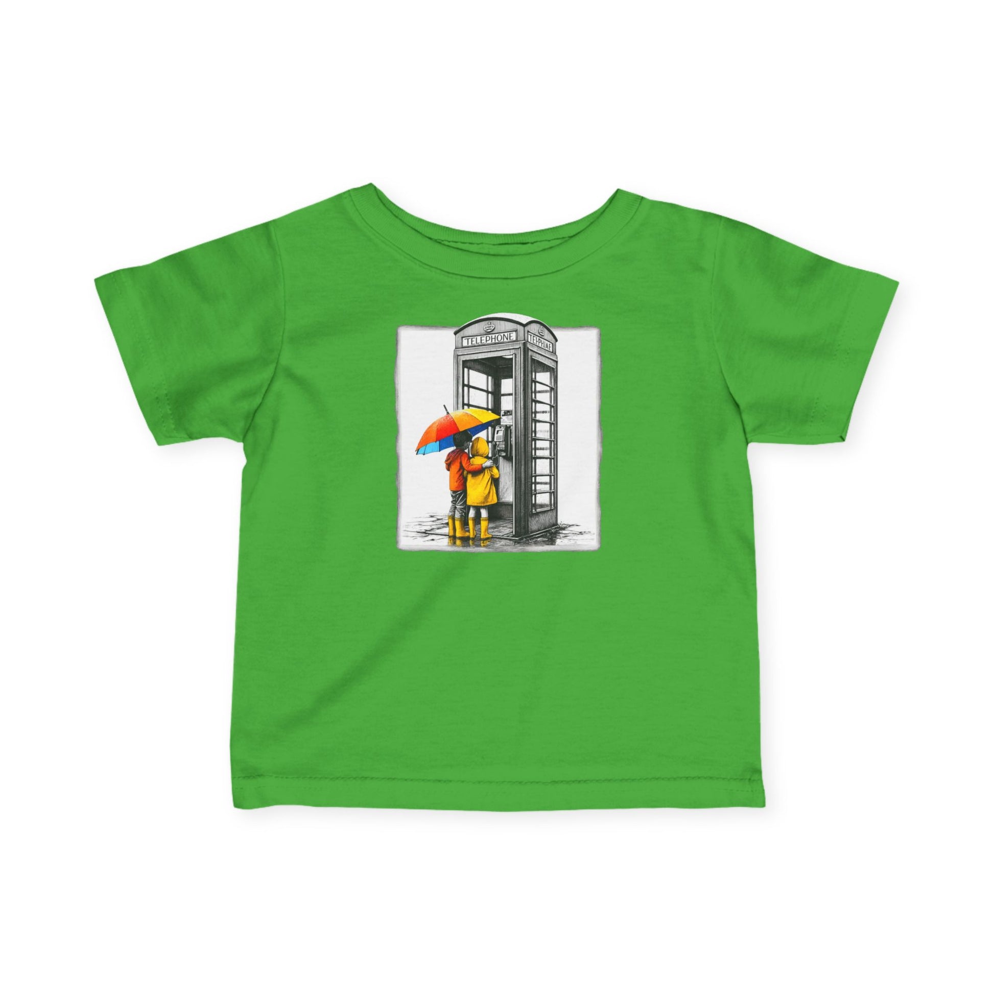 Dress your little adventurer in the "Standing Outside a Phonebooth With Change in My Pocket" T-shirt, capturing a charming and timeless moment. This delightful tee features a whimsical scene of a child in a bright yellow raincoat, holding an umbrella, by an iconic phone booth—an image that evokes curiosity and storytelling. The colored tees makes the detailed artwork pop, perfect for inspiring imaginative play on even the rainiest days. It's a wonderful choice for casual outings, photo ops, or just enjoying a cozy day indoors.