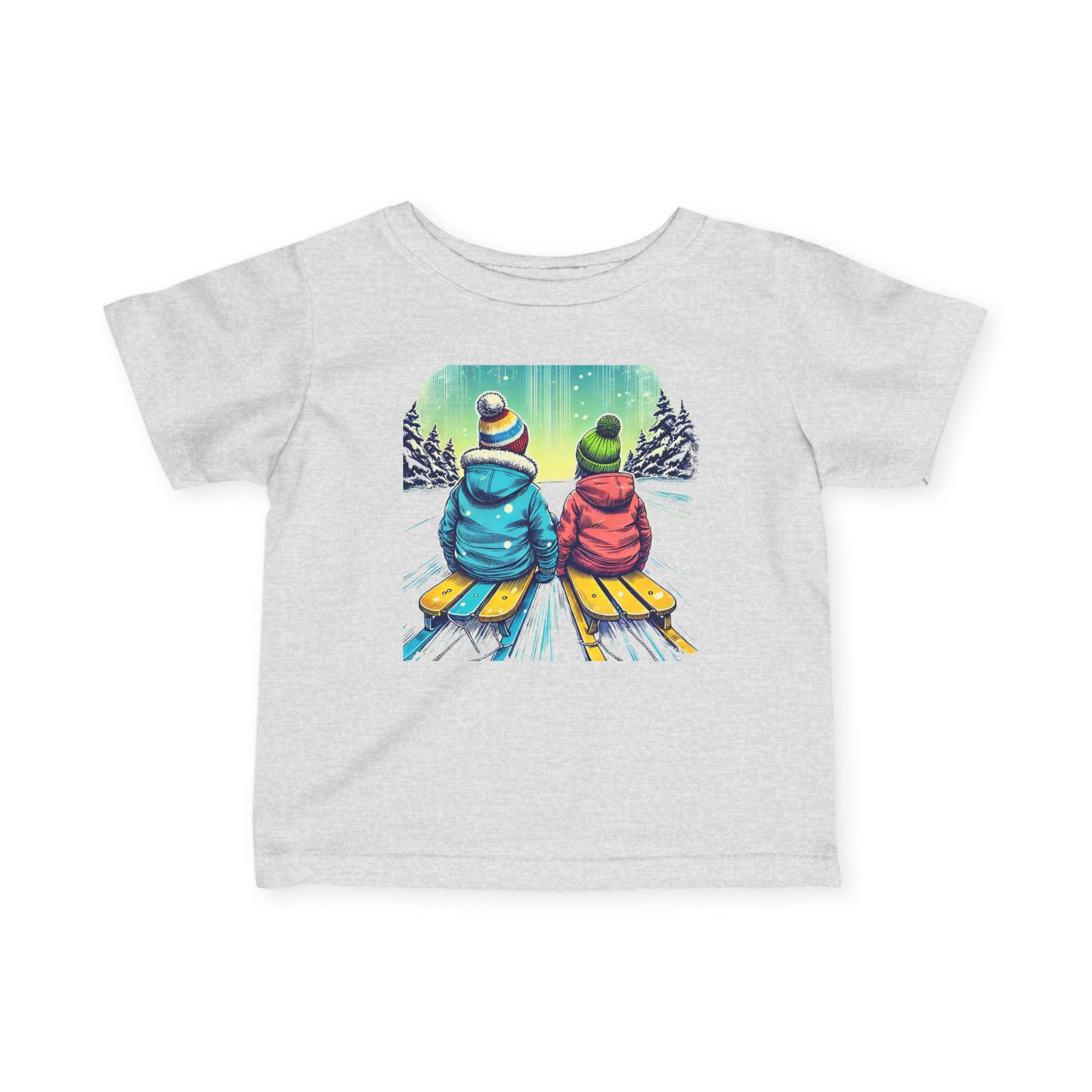 Introduce your little one to the joys of winter with the "Snow Day" T-shirt. This adorable tee captures the magic of a snowy day, featuring a heartwarming illustration of two children sitting on sleds, gazing at a winter wonderland. The tess highlights the excitement and beauty of a crisp, chilly day spent playing in the snow. Perfect for your infant's winter wardrobe, this shirt is both cozy and cheerful, making it an excellent choice for holiday photos, family gatherings, or just enjoying a day at home.